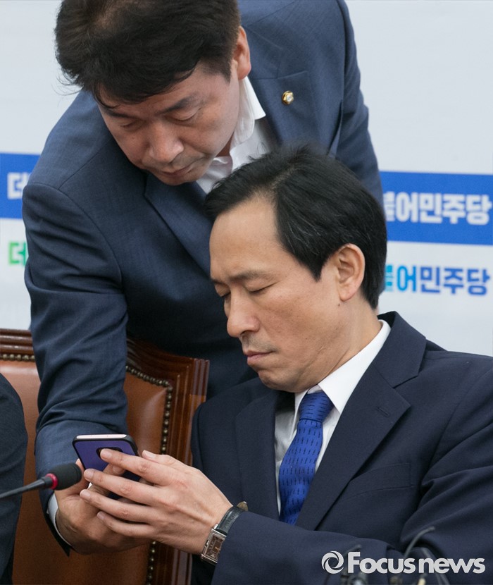 (서울=포커스뉴스) 15일 오전 서울 여의도 국회에서 열린 더불어민주당 사드대책위원회의에 참석한 우상호(오른쪽) 원내대표가 기동민 원내대변인으로부터 보고를 받고 있다.