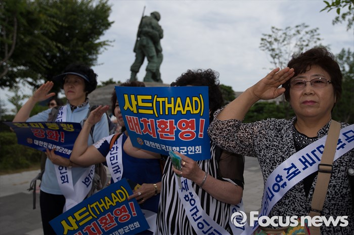 (서울=포커스뉴스) 15일 오전 서울 용산 국방부 앞에서 재향군인회 회원들 및 관계자들이 사드 배치 환영 기자회견 중 국기에 대한 경례를 하고 있다.