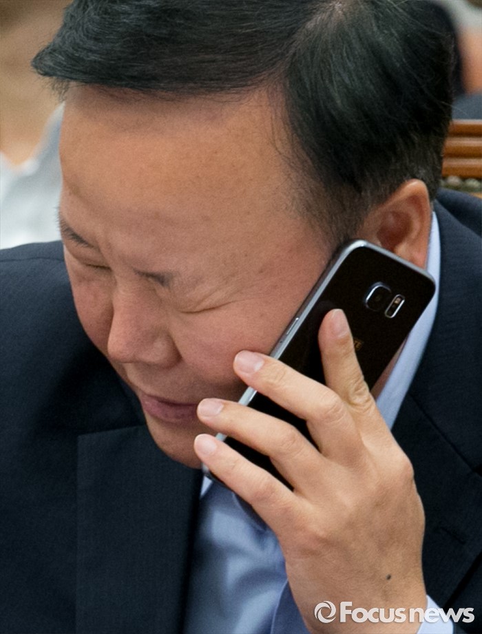 (서울=포커스뉴스) 15일 오전 서울 여의도 국회에서 예정된 운영위원회 전체회의에 참석한 김재원 청와대 정무수석이 누군가와 통화를 하고 있다. 이날 새누리당은 더불어민주당 소속 홍영표 국회 환경노동위원장이 야당 단독으로 예비비 지출안 등을 처리한 것과 관련해 홍 위원장의 사퇴를 요구하며 모든 상임위 보이콧을 선언했다.