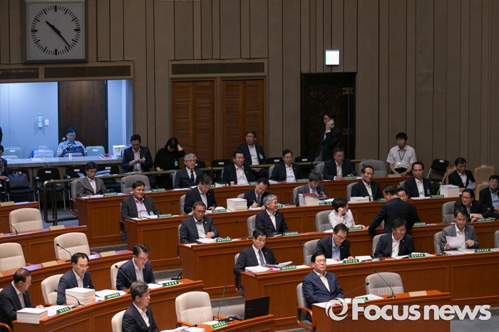 (서울=포커스뉴스) 15일 오전 서울 여의도 국회에서 예정된 예산결산특별위원회 전체회의에 참석한 국무위원들이 회의 시작을 기다리고 있다. 이날 새누리당은 더불어민주당 소속 홍영표 국회 환경노동위원장이 야당 단독으로 예비비 지출안 등을 처리한 것과 관련해 홍 위원장의 사퇴를 요구하며 모든 상임위 보이콧을 선언했다.