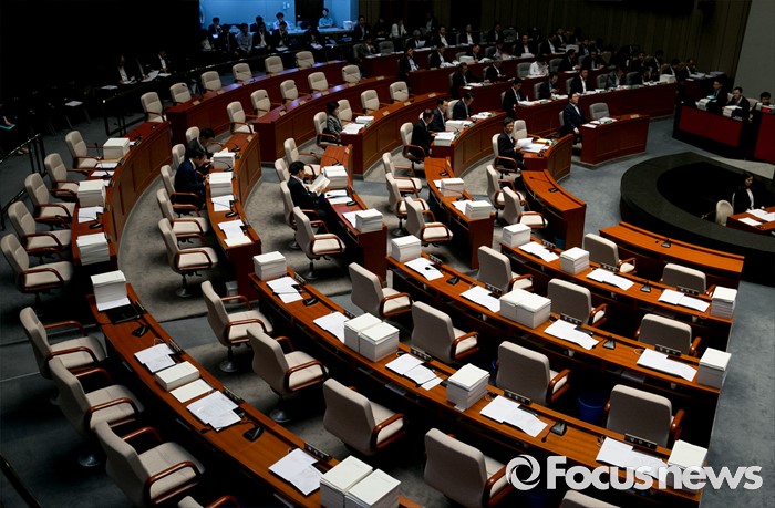 (서울=포커스뉴스) 15일 오전 서울 여의도 국회에서 예정된 예산결산특별위원회 전체회의에 새누리당 의원들이 불참해 빈 자리가 보이고 있다. 이날 새누리당은 더불어민주당 소속 홍영표 국회 환경노동위원장이 야당 단독으로 예비비 지출안 등을 처리한 것과 관련해 홍 위원장의 사퇴를 요구하며 모든 상임위 보이콧을 선언했다.