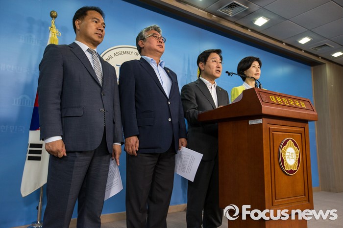 (서울=포커스뉴스) 국회 법제사법위원회 더불어민주당 간사 박범계(오른쪽 두 번째) 의원을 비롯한 야당 법사위 소속 의원들이 15일 오전 서울 여의도 국회에서 진경준 검사장 사건과 관련해 법무부 장관 및 검찰총장 사죄 촉구 기자회견을 하고 있다.