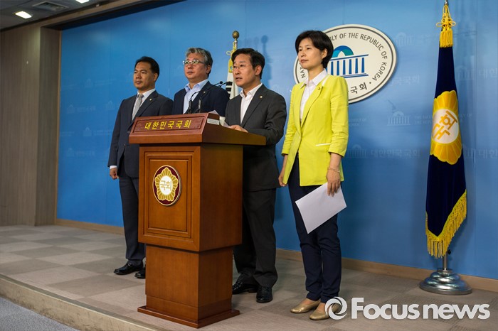 (서울=포커스뉴스) 국회 법제사법위원회 더불어민주당 간사 박범계(오른쪽 두 번째) 의원을 비롯한 야당 법사위 소속 의원들이 15일 오전 서울 여의도 국회에서 진경준 검사장 사건과 관련해 법무부 장관 및 검찰총장 사죄 촉구 기자회견을 하고 있다.