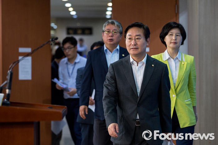 (서울=포커스뉴스) 국회 법제사법위원회 더불어민주당 간사 박범계 의원을 비롯한 야당 법사위 소속 의원들이 15일 오전 서울 여의도 국회에서 진경준 검사장 사건과 관련해 법무부 장관 및 검찰총장 사죄 촉구 기자회견을 하기 위해 브리핑실로 들어서고 있다.