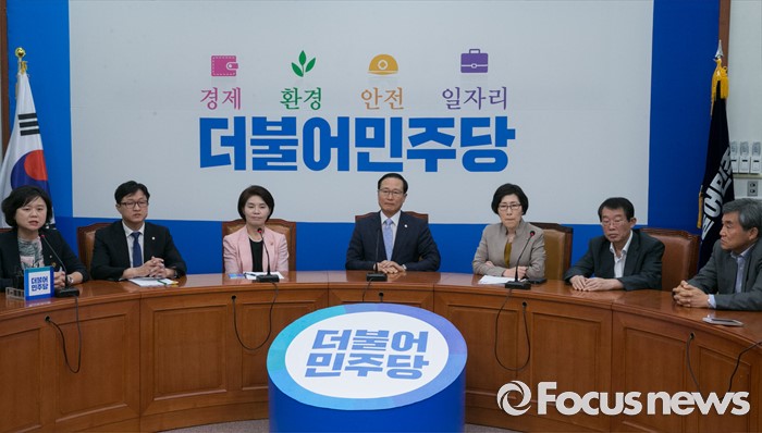 (서울=포커스뉴스) 15일 오전 서울 여의도 국회에서 홍영표 국회 환경노동위원장과 야당 환노위원들이 결산 표결 관련 입장을 전하는 기자간담회를 하고 있다. 이날 새누리당은 더불어민주당 소속 홍 위원장이 야당 단독으로 예비비 지출안 등을 처리한 것과 관련해 위원장 사퇴를 요구하며 모든 상임위 보이콧을 선언했다.