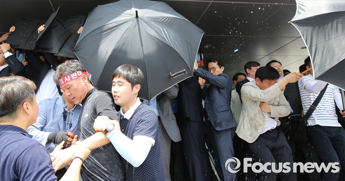 (성주=포커스뉴스) 황교안 국무총리와 한민구 국방부장관이 15일 오전 경북 성주군청광장에서 사드(THAAD, 고고도미사일방어체계) 배치에 대한 주민설명회를 가진 가운데 성난 주민이 물병과 소금, 계란을 투척하고 있다.