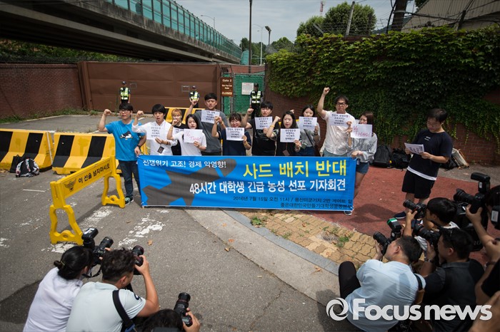 (서울=포커스뉴스) 좋은 대한민국 만들기 대학생 운동본부' 소속 학생들이 15일 오전 서울 용산 미군 기지 앞에서 '사드 배치 반대 48시간 대학생 긴급농성 선포' 기자회견을 열고 있다. 이날 대학생들은 기자회견을 마친 후 용산 미군 기지 2번 게이트 앞에서 48시간 농성에 들어갔다.