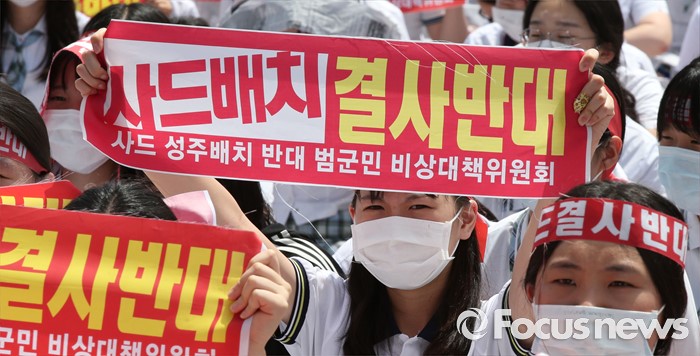 (성주=포커스뉴스) 황교안 국무총리와 한민구 국방부장관이 15일 오전 경북 성주군청광장에서 사드(THAAD, 고고도미사일방어체계) 배치에 대한 주민설명회를 가진 가운데 성주 주민들이 사드배치 반드를 주장하고 있다.