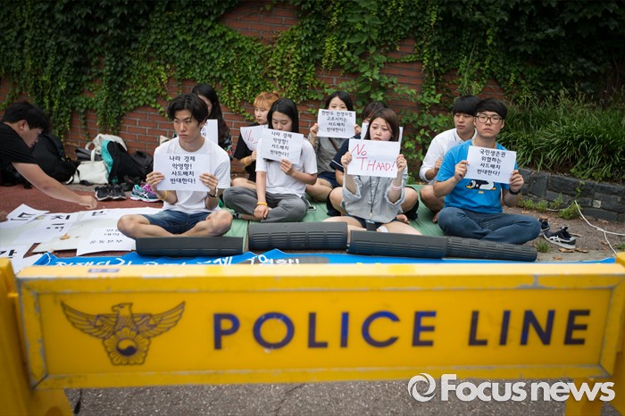 (서울=포커스뉴스) 좋은 대한민국 만들기 대학생 운동본부' 소속 학생들이 15일 오전 서울 용산 미군 기지 앞에서 '사드 배치 반대 48시간 대학생 긴급농성 선포' 기자회견을 마친 후 농성에 들어가고 있다.