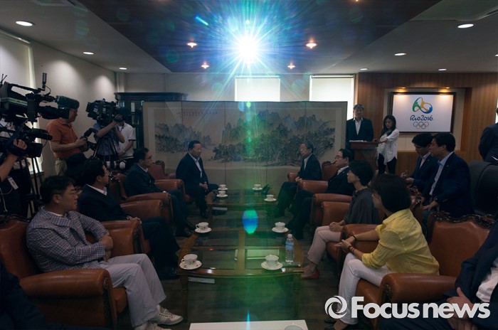(서울=포커스뉴스) 15일 오전 서울 노원구 태릉선수촌에서 리우올림픽에 출전하는 선수들을 격려하기 위해 방문한 김희옥 새누리당 혁신비상대책위원장이 김정행 대한체육회장을 비롯한 관계자들과 이야기를 나누고 있다.
