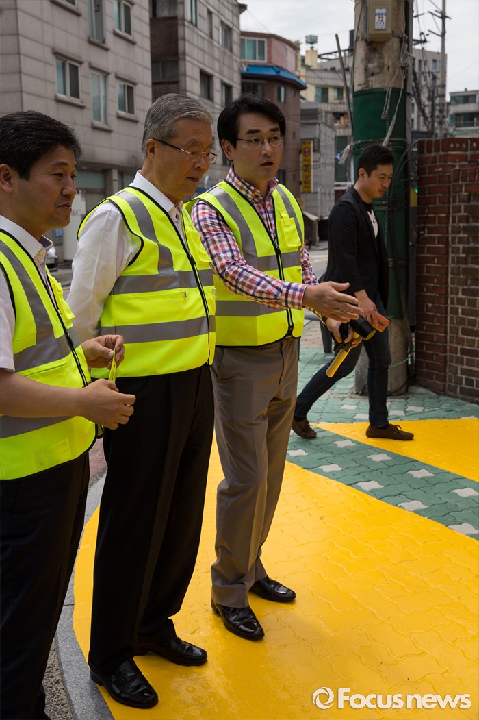 (서울=포커스뉴스) 김종인(가운데) 더불어민주당 비상대책위원회 대표가 15일 오전 서울 성북구 안암초등학교 앞에서 열린 아동안전 프로젝트 '옐로 카펫' 제작행사에 참여해 관계자들에게 설명을 듣고 있다.