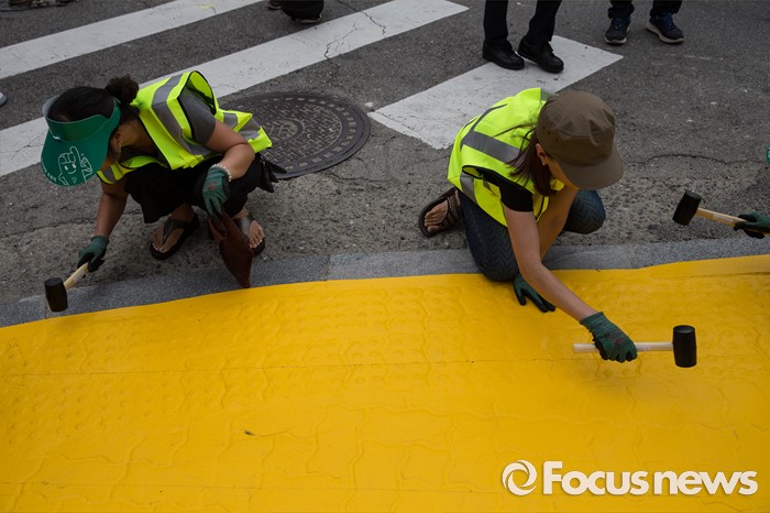 (서울=포커스뉴스) 15일 오전 서울 성북구 안암초등학교 앞에서 열린 아동안전 프로젝트 '옐로카펫' 제작행사에 참여한 학부모 및 행사 관계자들이 카펫을 설치하고 있다.