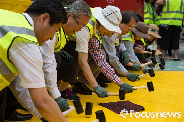 (서울=포커스뉴스) 김종인(왼쪽 두 번째) 더불어민주당 비상대책위원회 대표가 15일 오전 서울 성북구 안암초등학교 앞에서 열린 아동안전 프로젝트 '옐로 카펫' 제작행사에 참여해 관계자들과 카펫을 설치하고 있다.
