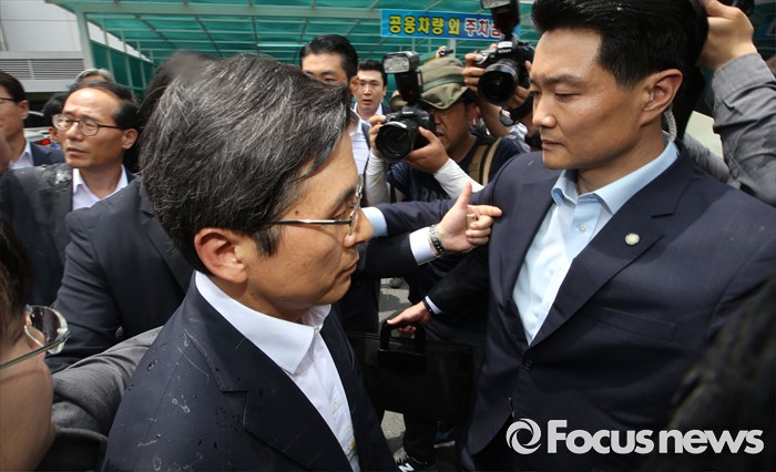 (성주=포커스뉴스) 황교안 국무총리와 한민구 국방부장관이 15일 오전 경북 성주군청광장에서 사드(THAAD, 고고도미사일방어체계) 배치에 대한 주민설명회를 마치고 차량으로 이동하고 있다. 총리 자켓과 머리에 성난 주민이 투척한 물병과 계란 자국이 보이고 있다.