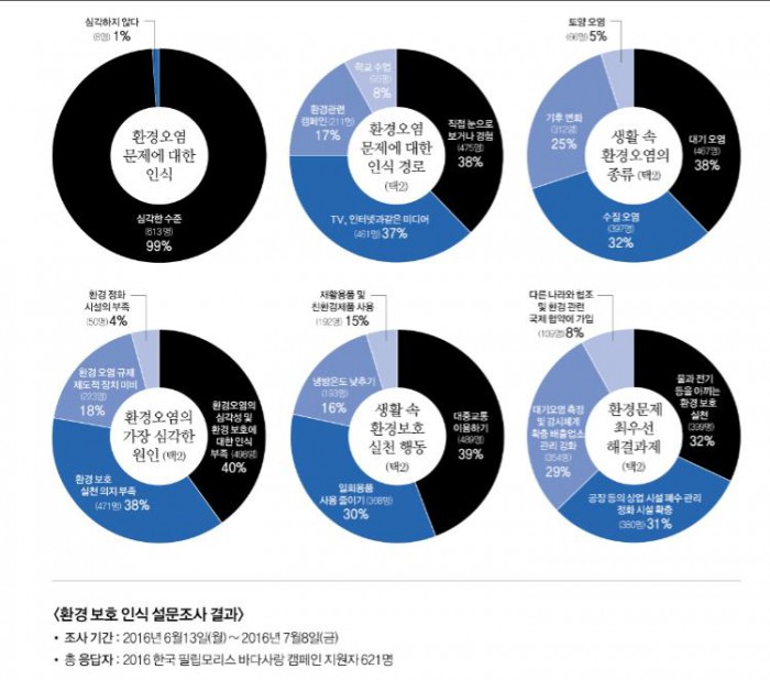 '아름다운 세상을 위한 공동체 포럼'은 '2016 한국필립모리스 바다사랑 캠페인' 지원자 총 621명을 대상으로 지난 6월13일부터 7월8일까지 홈페이지를 통해 실시한 '환경보호 인식 조사' 결과를 15일 발표했다.