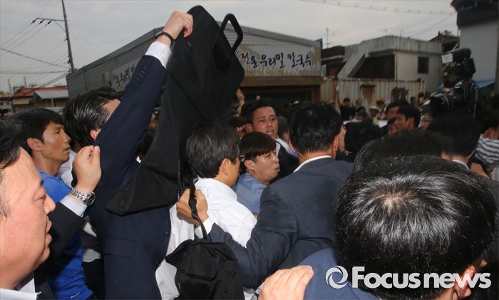 (성주=포커스뉴스) 황교안 국무총리와 한민구 국방부장관이 15일 경북 성주군청광장에서 사드(THAAD, 고고도미사일방어체계) 배치에 대한 주민설명회를 마치고 차량에 갖혀 6시간 넘게 대치중 버스에서 내려 승용차로 갈아탔지만 승요차도 막히자 황 총리가 차량에서 내려 빠져나가고 있다.