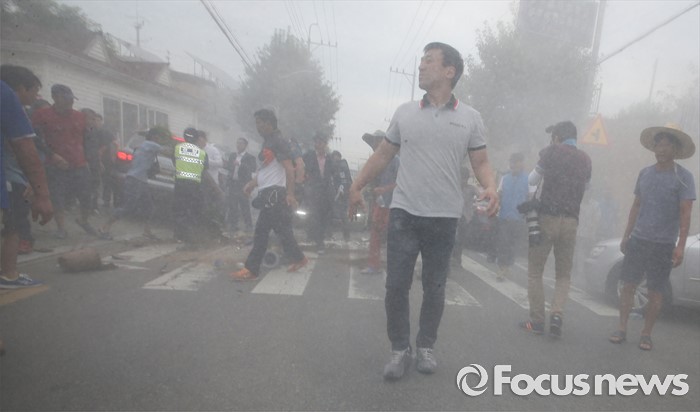(성주=포커스뉴스) 황교안 국무총리와 한민구 국방부장관이 15일 경북 성주군청광장에서 사드(THAAD, 고고도미사일방어체계) 배치에 대한 주민설명회를 마치고 차량에 갖혀 6시간 넘게 대치중 버스에서 내려 승용차로 빠져나가려 하자 성주 주민들이 총리가 탑승한 차량을 막고 있다.