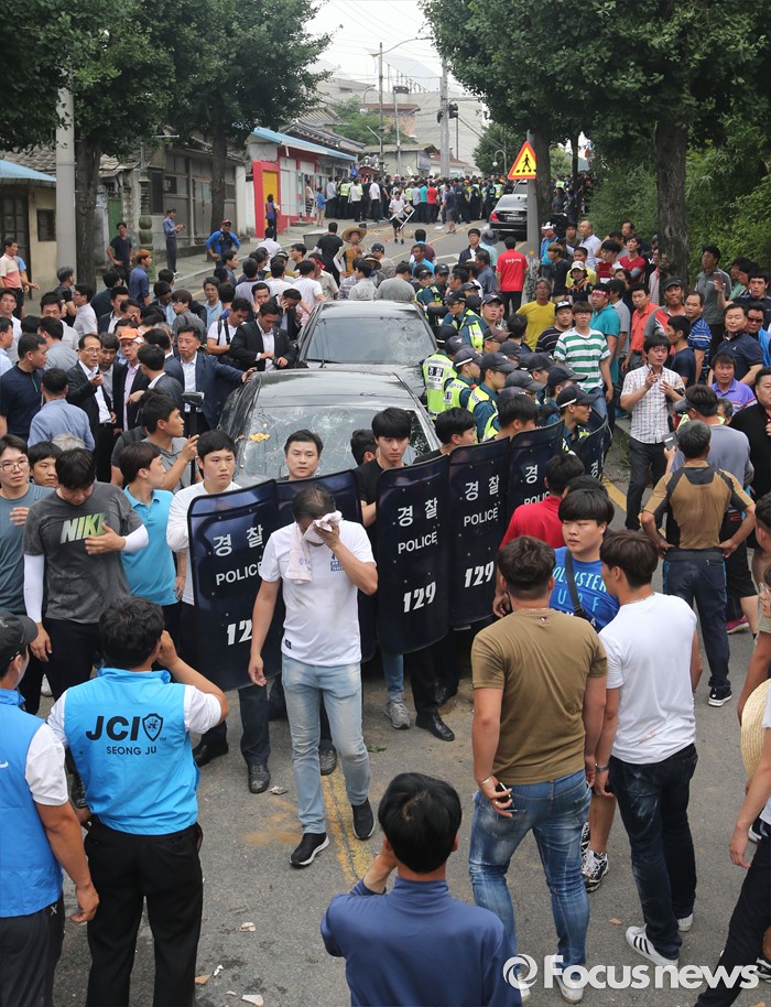 (성주=포커스뉴스) 황교안 국무총리와 한민구 국방부장관이 15일 경북 성주군청광장에서 사드(THAAD, 고고도미사일방어체계) 배치에 대한 주민설명회를 마치고 차량에 갖혀 6시간 넘게 대치중 버스에서 내려 승용차로 빠져나가려 하자 성주 주민들이 총리가 탑승한 차량을 막고 있다.