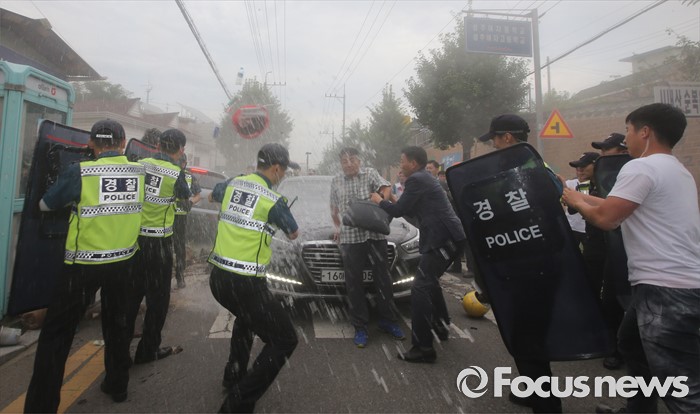 (성주=포커스뉴스) 황교안 국무총리와 한민구 국방부장관이 15일 경북 성주군청광장에서 사드(THAAD, 고고도미사일방어체계) 배치에 대한 주민설명회를 마치고 차량에 갖혀 6시간 넘게 대치중 버스에서 내려 승용차로 빠져나가려 하자 성주 주민들이 총리가 탑승한 차량을 막고 있다.