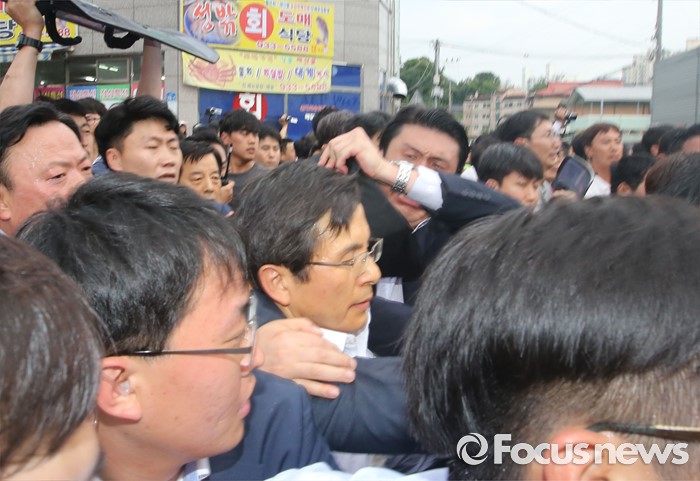 (성주=포커스뉴스) 황교안 국무총리와 한민구 국방부장관이 15일 경북 성주군청광장에서 사드(THAAD, 고고도미사일방어체계) 배치에 대한 주민설명회를 마치고 차량에 갖혀 6시간 넘게 대치중 버스에서 내려 승용차로 갈아탔지만 승요차도 막히자 황 총리가 차량에서 내려 빠져나가고 있다.