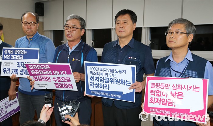 (세종=포커스뉴스) 15일 저녁 세종시 정부세종청사 고용노동부에서 열린 최저임금위원회 제13차 전원회의에서 근로자 위원들이 운영위원회와 논의하지 않은 일방적인 회의 진행으로 심의에 동참할 수 없다고 밝히고 있다.