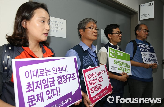(세종=포커스뉴스) 15일 저녁 세종시 정부세종청사 고용노동부에서 열린 최저임금위원회 제13차 전원회의에서 근로자 위원들이 운영위원회와 논의하지 않은 일방적인 회의 진행으로 심의에 동참할 수 없다고 밝히고 구호를 외치고 있다.