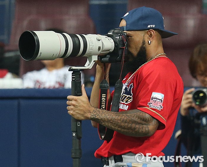 (서울=포커스뉴스) 16일 서울 고척 스카이돔에서 열린 2016 프로야구 올스타 경기에 앞서 가진 번트왕 대회에서 나눔팀의 테임즈가 망원렌즈가 부착된 카메라를 들여다 보고 있다.