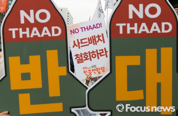 (서울=포커스뉴스) 16일 오후 서울 종로구 청계광장에서 사드한국배치반대전국대책회의 회원들이 사드 배치 결정 철회 평화행동을 하고 있다.