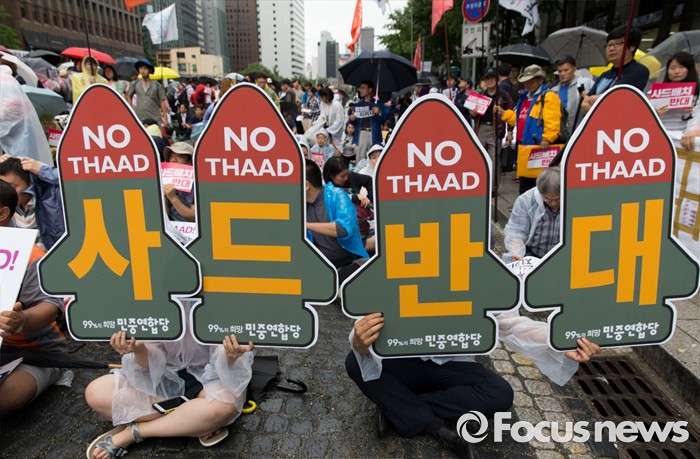 (서울=포커스뉴스) 16일 오후 서울 종로구 청계광장에서 사드한국배치반대전국대책회의 회원들이 사드 배치 결정 철회 평화행동을 하고 있다.