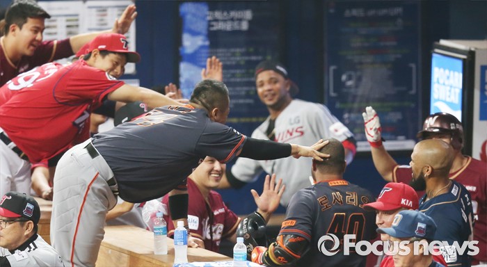 (서울=포커스뉴스) 16일 서울 고척 스카이돔에서 열린 2016 프로야구 올스타 경기에서 나눔팀 로사리오가 2회초 좌월 솔로 홈런을 치고 더그아웃에서 동료들의 축하를 받고 있다.