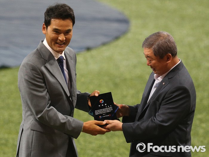 (서울=포커스뉴스) 16일 서울 고척 스카이돔에서 열린 2016 프로야구 올스타 경기에 앞서 구본능 KBO 총재가 박찬호에게 KBO 국제홍보위원 위촉패를 전달하고 있다.