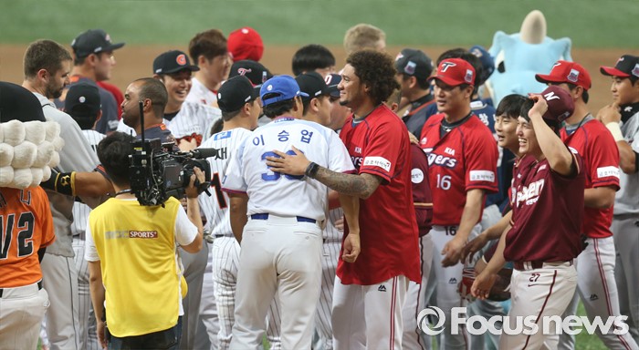 (서울=포커스뉴스) 16일 서울 고척 스카이돔에서 열린 2016 프로야구 올스타전에서 드림팀과 나눔팀 선수들이 경기를 마치고 한데 어울려 악수를 하고 있다.