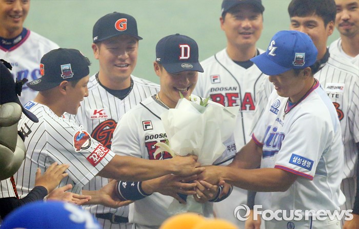 (서울=포커스뉴스) 16일 서울 고척 스카이돔에서 열린 2016 프로야구 올스타전에서 MVP로 선정돌것 같은 드림팀의 민병헌에게 동료들이 꽃다발을 전달하고 있다.