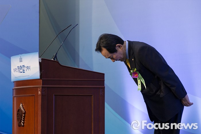 (서울=포커스뉴스) 정세균 국회의장이 17일 오전 서울 영등포구 여의도 국회의사당 중앙홀에서 열린 제68주년 제헌절 경축식에 참석해 인사하고 있다.