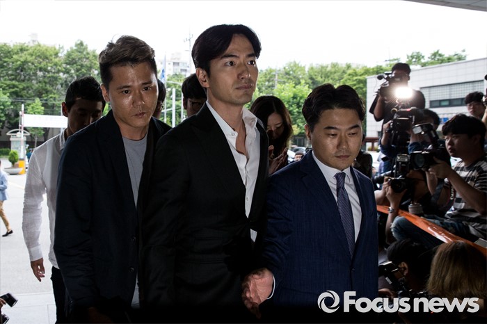 (서울=포커스뉴스) 성폭행 혐의로 피소된 배우 이진욱(가운데)이 17일 오후 서울 강남구 수서경찰서로 출석하고 있다.