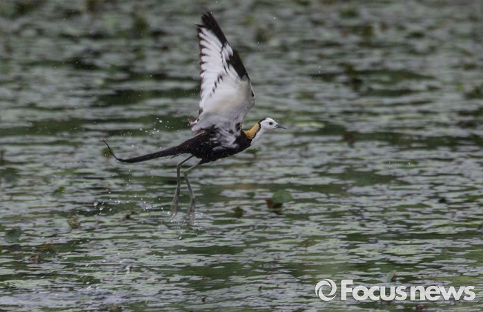 (의왕=포커스뉴스) 아열대성 조류인 물꿩이 경기도 의왕시 왕송지에 나타나, 지금까지 한반도에서 관찰된 이래 가장 최북단에서 발견됐다. 연밭에서 주로 서식하는 물꿩은 아열대성 기후인 동남아에서 주로 서식하나, 최근 제주 한경면에서 처음 관찰된 이래, 경남 주남,우포, 충남 천수만에서 발견, 번식하고 있다. 화려한 깃털의 물꿩은 연밭이나 수초위에서 활동하도록 긴 발가락을 가진 것이 특징이며 번식철에는 꿩처럼 꼬리가 길다. 호사도요처럼 일처다부제의 습성을 보이며, 수컷이 새끼들을 양육한다.