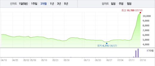 이는 일주일 전 주가인 11일(4850원)과 비교했을 때 120% 상승한 수치다.