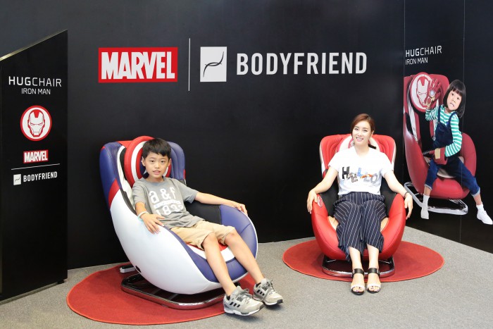 (서울=포커스뉴스) 헬스케어 그룹 바디프랜드는 업계 최초로 미국 마블사와 손잡고 '어벤저스' 캐릭터 '아이언맨'과 '캡틴아메리카'를 각각 모티브로 디자인한 콤팩트 안마의자 '허그체어'를 선보인다고 18일 밝혔다.