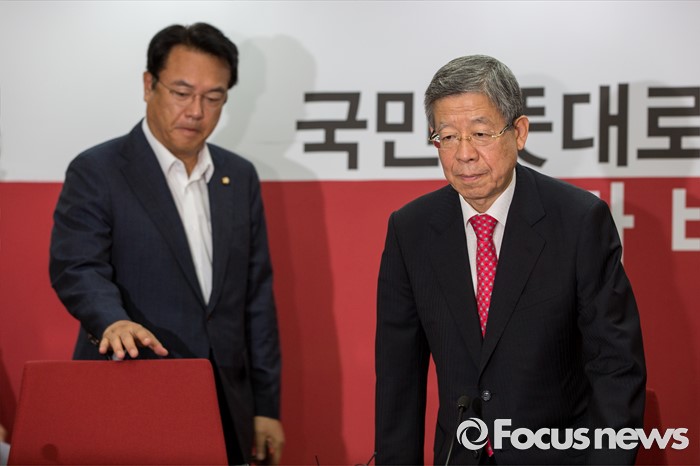 (서울=포커스뉴스) 김희옥(오른쪽) 새누리당 혁신비상대책위원장과 정진석 원내대표가 18일 오전 서울 여의도 새누리당사에서 열린 혁신비상대책위원회의에 참석 하기 위해 회의실로 들어서고 있다.
