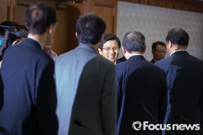 (서울=포커스뉴스) 황교안 국무총리가 18일 오전 서울 종로구 정부서울청사에서 열린 6.25 전쟁 납북피해진상규명위원회에서 민간위원들과 인사를 하고 있다.