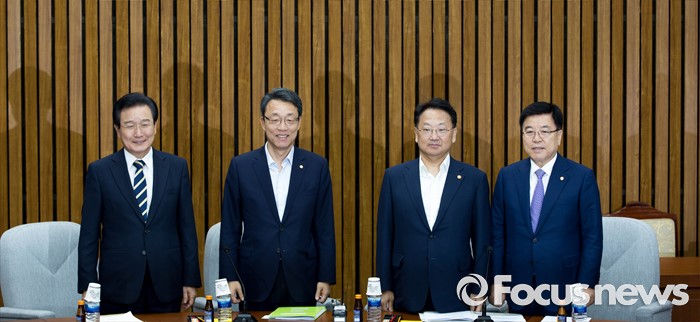(서울=포커스뉴스) 여야3당 정책위의장과 경제부총리가 18일 오전 서울 여의도 국회에서 열린 '3당 정책위의장-경제부총리, 3차 민생경제 현안점검회의'에 참석해 사진촬영 하고 있다. 왼쪽부터 변재일 더불어민주당 정책위의장, 김성식 국민의당 정책위의장, 유일호 경제부총리 겸 기획재정부 장관, 김광림 새누리당 정책위의장.