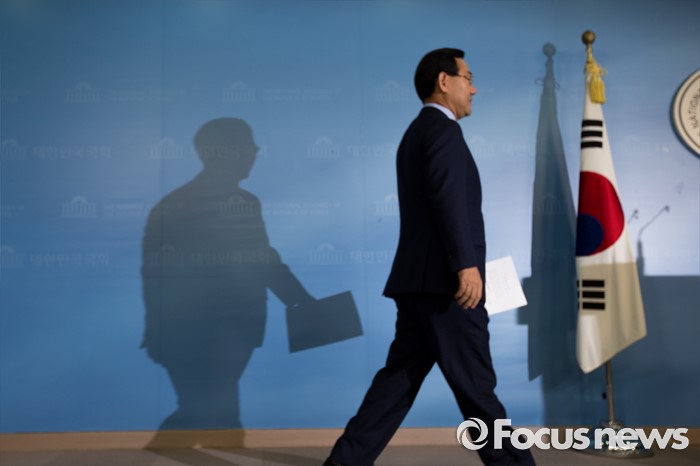 (서울=포커스뉴스) 주호영 새누리당 의원이 18일 오전 서울 여의도 국회에서 오는 8월9일 열릴 전당대회 당대표 출마 선언을 하기 위해 기자회견장으로 들어서고 있다.