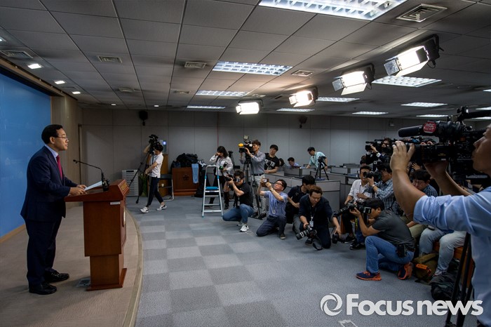 (서울=포커스뉴스) 주호영 새누리당 의원이 18일 오전 서울 여의도 국회에서 오는 8월9일 열릴 전당대회 당대표 출마 선언을 하고 있다.