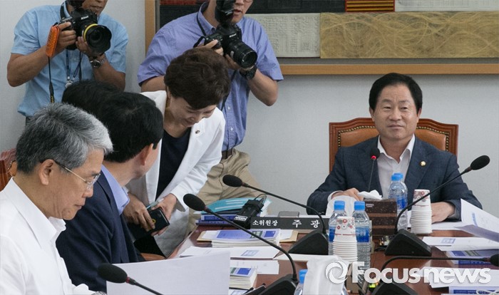 (서울=포커스뉴스) 18일 오전 서울 여의도 국회에서 열린 예산결산특별위원회 결산심사소위원회에 참석한 김현미(가운데) 예결위원장이 격려 방문해 인사하고 있다. 오른쪽은 주광덕 소위원장.