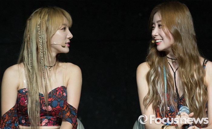 (서울=포커스뉴스) 18일 오전 서울 마포구 하나투어 브이홀에서 열린 걸그룹 스텔라의 미니앨범 'CRY' 발표 쇼케이스에 참여한 멤버 민희(왼쪽)와 가영이 대화를 나누고 있다.