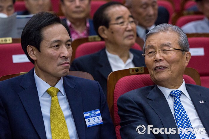 (서울=포커스뉴스) 김종인(오른쪽) 더불어민주당 비상대책위 대표와 우상호 원내대표가 18일 오후 서울 여의도 국회의원회관에서 열린 '더불어민주당 중앙위원회의'에 참석해 대화 하고 있다.