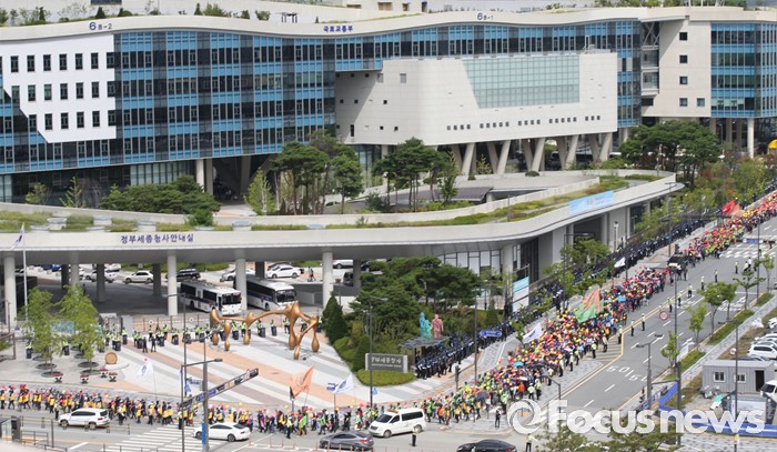 (세종=포커스뉴스) 전국건설기계연합회 구성원들이 18일 오후 세종시 정부세종청사 국토교통부 앞에서 굴삭기 수급조절을 통해 임대사업자를 보호할 것을 촉구하며 가두행진을 하고 있다.