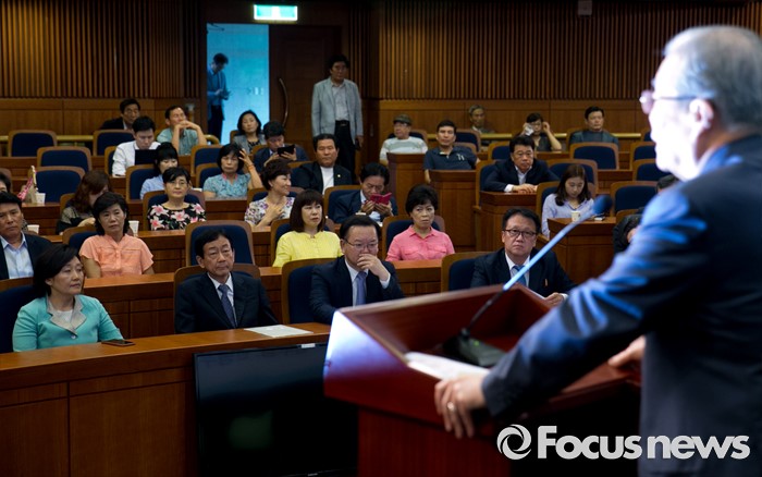 (서울=포커스뉴스) 18일 오후 서울 여의도 국회 헌정기념관에서 한국적 제3의 길 후원으로 열린 '개헌을 말하다 의원 대담, 어떤 헌법인가?'에 참석한 김종인 더불어민주당 비대위 대표가 축사를 하고 있다.