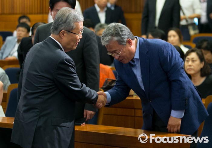 (서울=포커스뉴스) 18일 오후 서울 여의도 국회 헌정기념관에서 한국적 제3의 길 후원으로 열린 '개헌을 말하다 의원 대담, 어떤 헌법인가?'에 참석한 김종인(왼쪽) 더불어민주당 비대위 대표가 유성엽 국민의당 의원과 인사하고 있다.