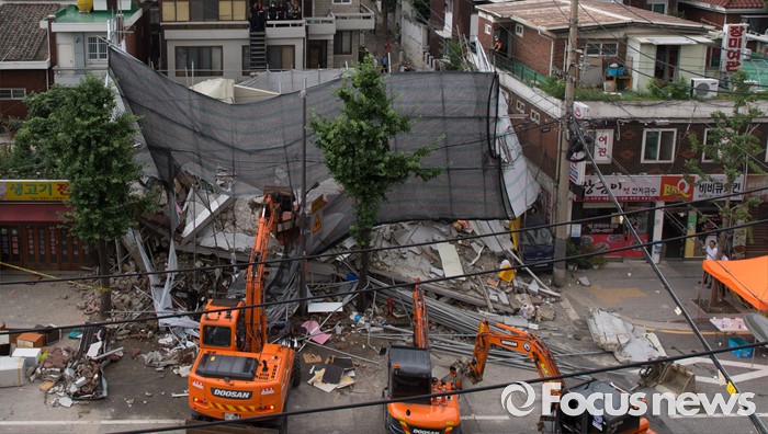 (서울=포커스뉴스) 18일 오후 서울 서대문구 홍은동 한 공사장에서 붕괴사고가 일어나 소방대원들이 구조작업을 벌이고 있다. 소방당국은 붕괴된 건물 지하에 1명이 매몰되어 있다고 밝혔다.